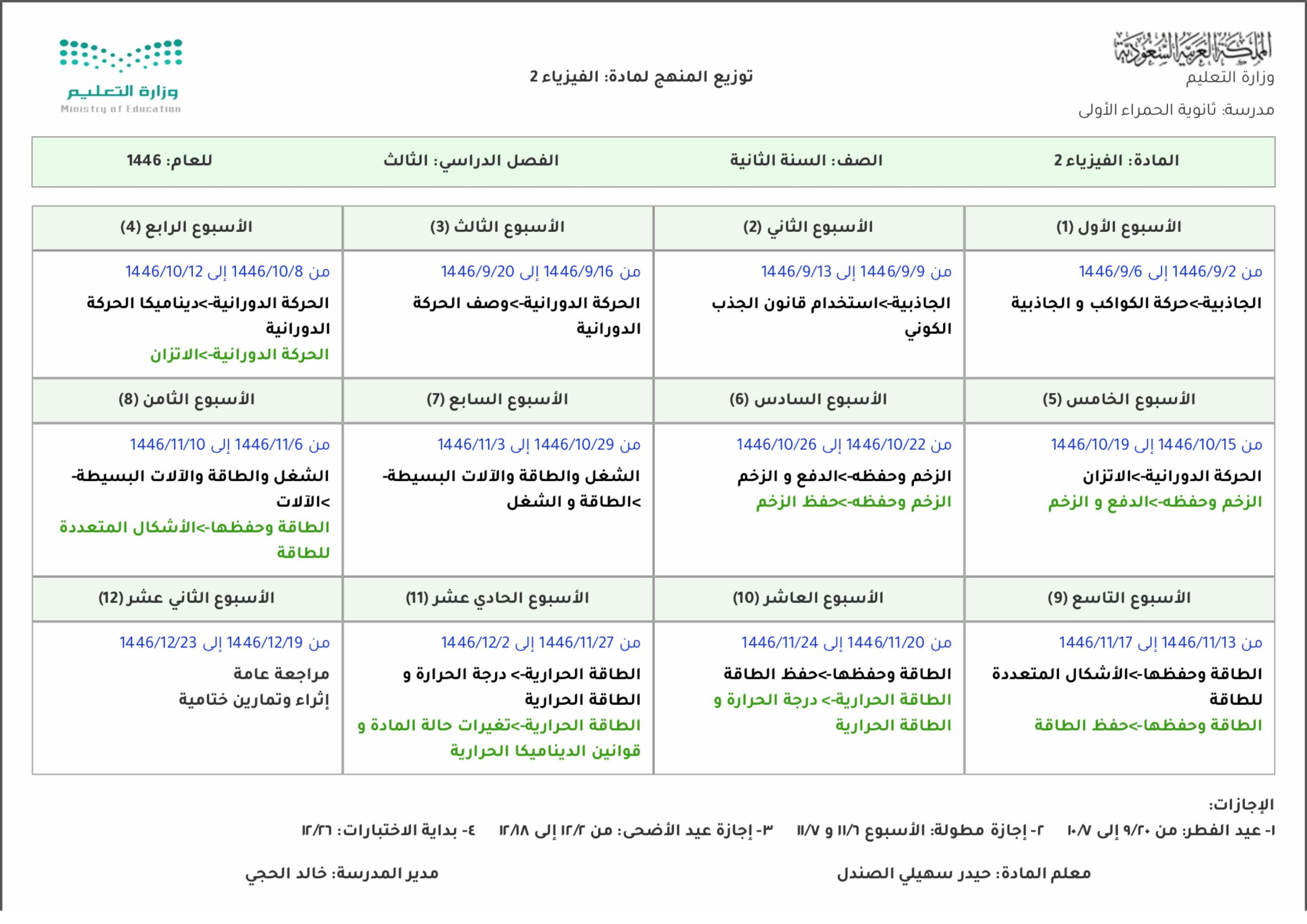 توزيع مقرر (فيزياء2) الفصل الدراسي الثالث لعام 1446هــ