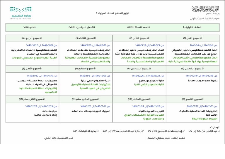 توزيع مقرر (فيزياء3) الفصل الدراسي الثالث لعام 1446هــ